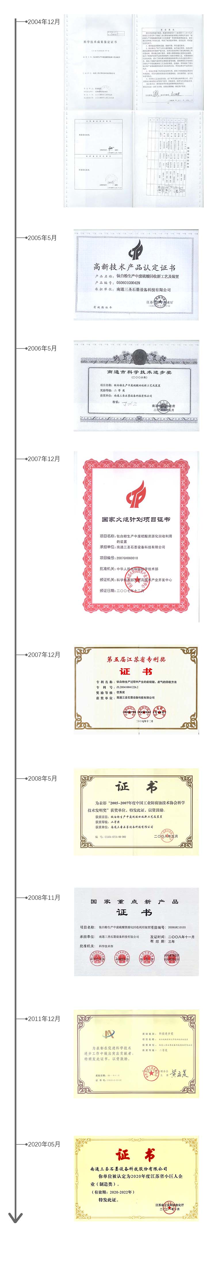 南通三圣該項(xiàng)技術(shù)先后得到了政府諸多部門的高度評(píng)價(jià)。2004年12月,“鈦白粉生產(chǎn)中廢硫酸回收新工藝及裝置”通過(guò)江蘇省科技廳組織的科技成果鑒定,鑒定意見指出,該項(xiàng)成果填補(bǔ)了國(guó)內(nèi)鈦白粉產(chǎn)業(yè)廢硫酸回收技術(shù)及裝備的空白,總體水平達(dá)到國(guó)際先進(jìn)。2005年5月,該項(xiàng)成果被認(rèn)定為江蘇省高新技術(shù)產(chǎn)品。2006年5月,該項(xiàng)成果榮獲南通市科技進(jìn)步二等獎(jiǎng)。2007年12月,“鈦白粉生產(chǎn)中廢硫酸資源化回收利用的裝置”被科技部列為國(guó)家火炬計(jì)劃項(xiàng)目。2007年12月,“鈦白粉生產(chǎn)過(guò)程中產(chǎn)生的廢硫酸、廢氣的回收方法”榮獲江蘇省優(yōu)秀專利獎(jiǎng)。2008年5月,“鈦白粉生產(chǎn)中廢硫酸回收新工藝及裝置”榮獲中國(guó)工業(yè)防腐蝕技術(shù)協(xié)會(huì)技術(shù)發(fā)明二等獎(jiǎng)。2008年11月,“鈦白粉生產(chǎn)中廢硫酸資源化回收利用裝置”被科技部、環(huán)保部、商務(wù)部、國(guó)家質(zhì)檢總局認(rèn)定為國(guó)家重點(diǎn)新產(chǎn)品。2011年12月,“鈦白廢酸資源化節(jié)能回收系統(tǒng)裝置”榮獲中華全國(guó)工商業(yè)聯(lián)合會(huì)科技進(jìn)步二等獎(jiǎng)。2020年,公司以工業(yè)廢副硫酸低能耗蒸發(fā)濃縮與資源化回收成套裝備產(chǎn)品獲得江蘇省專精特新小巨人企業(yè)榮譽(yù)稱號(hào)。